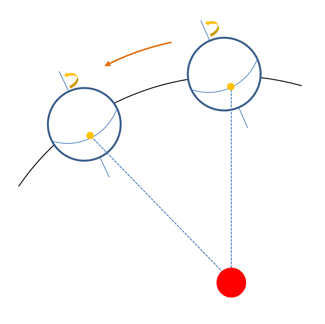 만약 지구가 완전 누워서 돈다고 가정해보겠습니다. 이때 태양이 남중해서 다음 날 남중할 때까지 지구는 딱 한 바퀴, 360도만 돌면 됩니다. 지구의 공전과는 전혀 상관이 없어집니다. 따라서 가정 1보다 하루의 길이가 짧습니다.